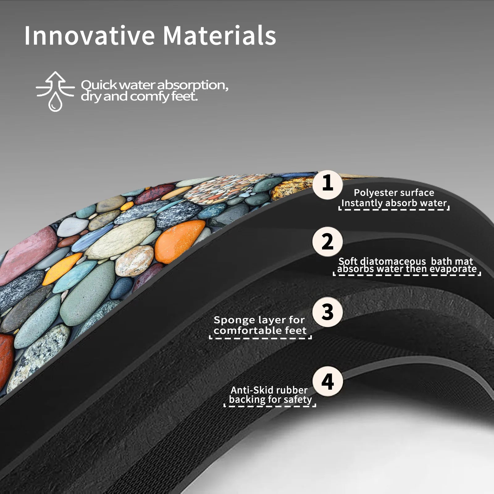 2.Diatom mud fabric surface can absorb moisture quickly; Foam absorbent layer can absorb water instantly and evaporate quickly.