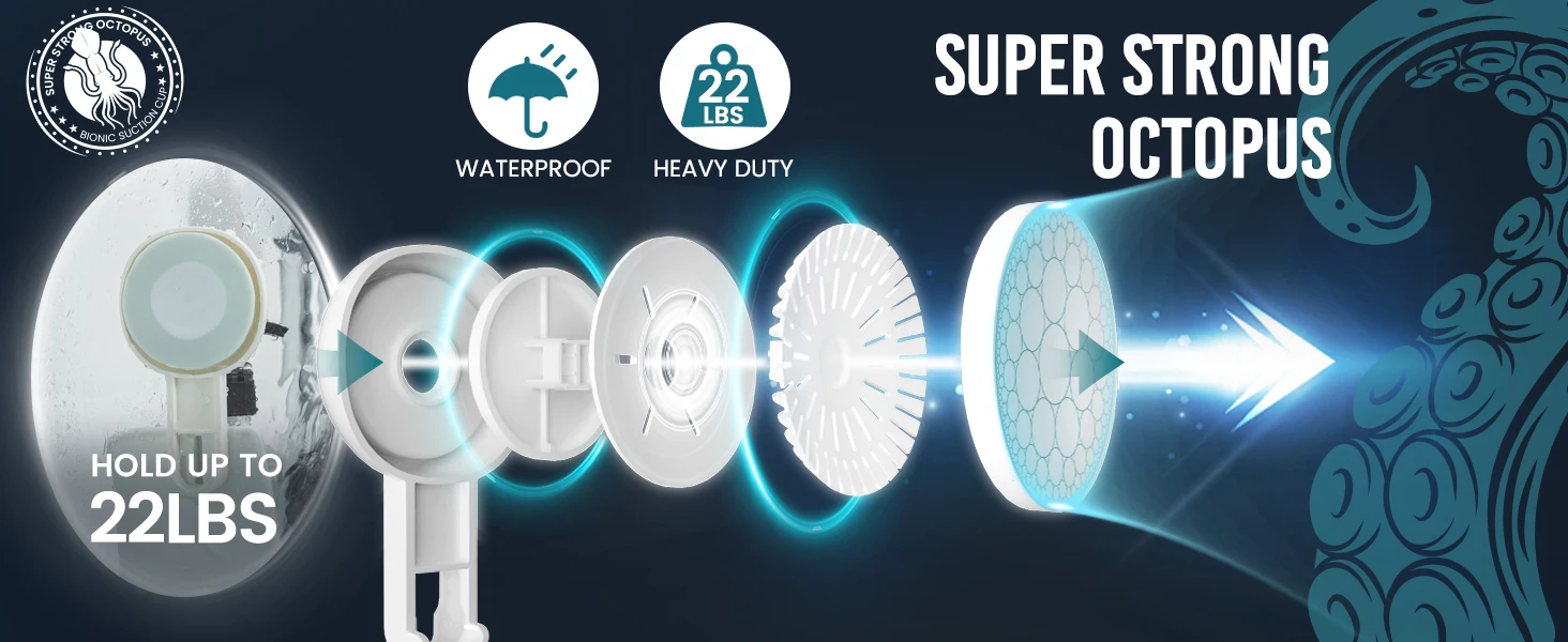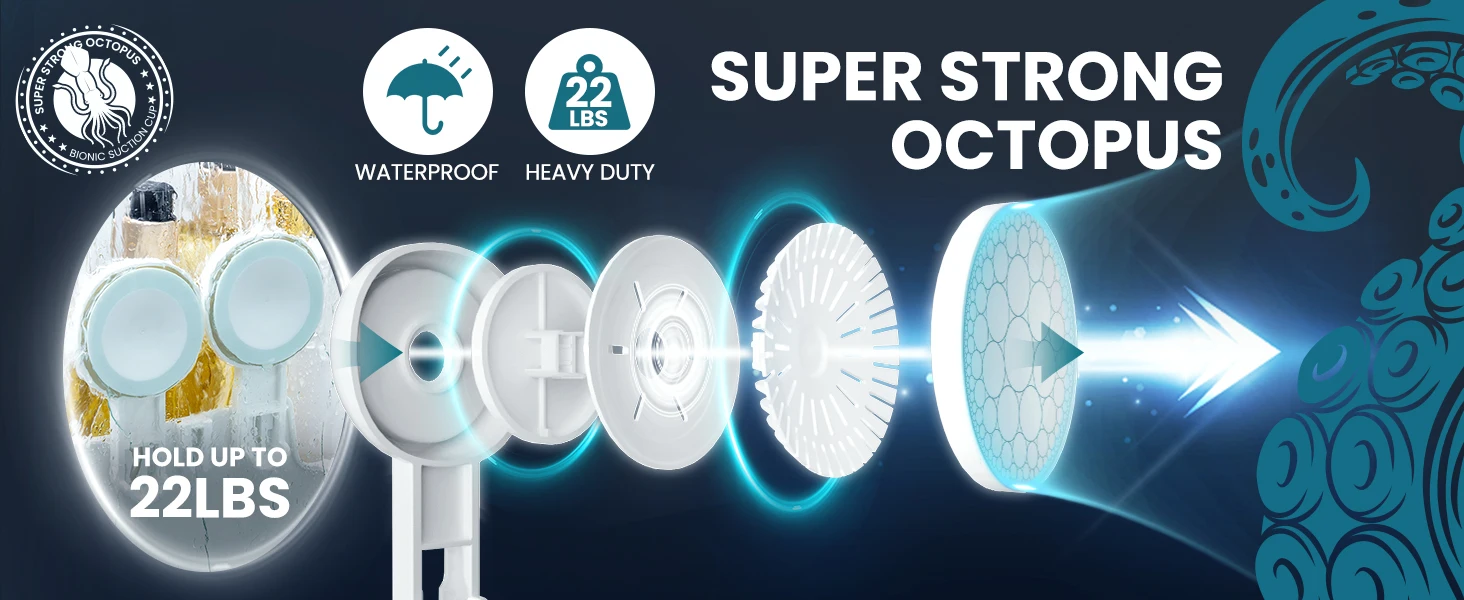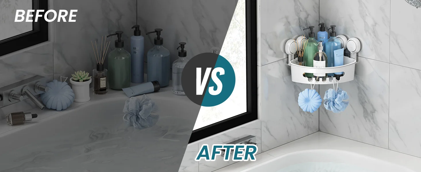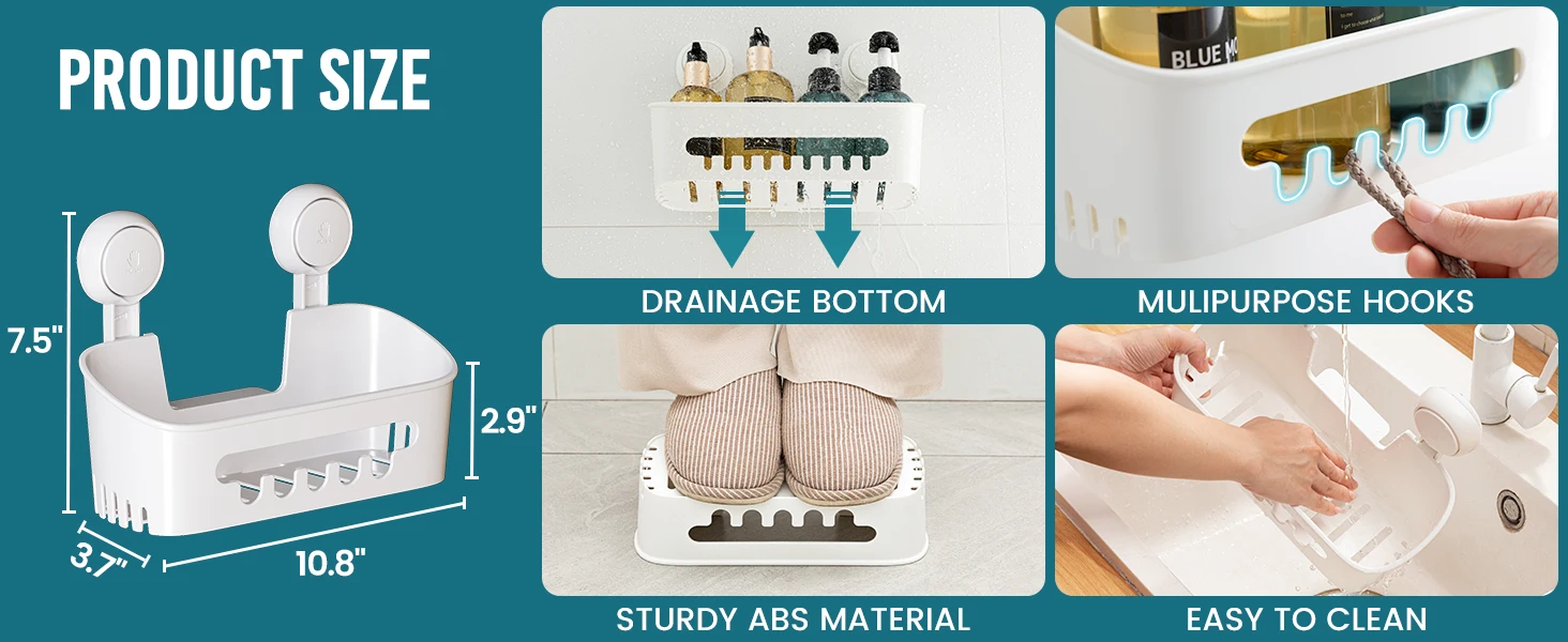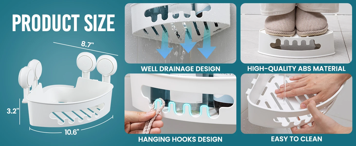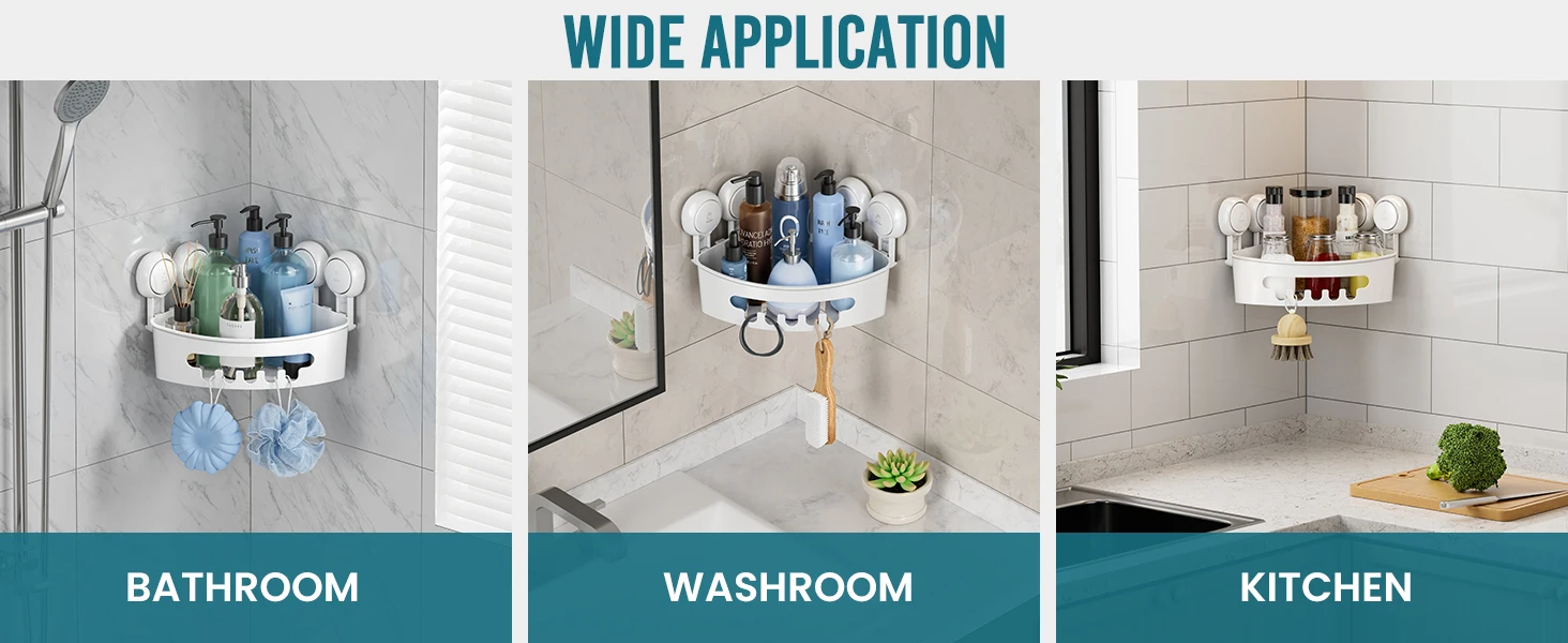 DURABILITY & STRONG SUCTION: Corner shower caddy is made of premium thickened ABS material. Our suction cup based on the bionics octopus sucker principle is made of TPE material, which hold up to 22 LBS. The shower organizer suction is waterproof and oilproof so it can be used in bathroom and kitchen