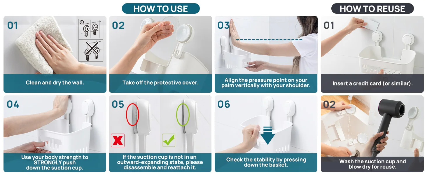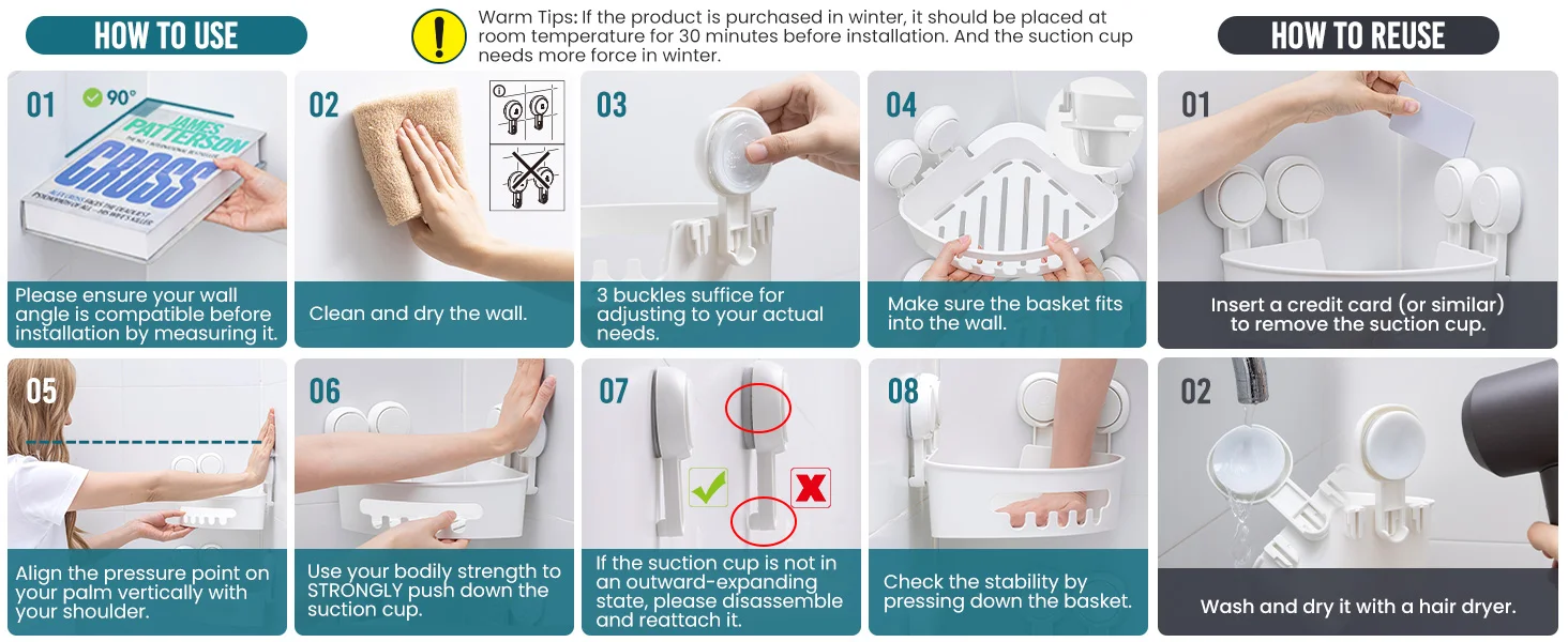 HASSLE-FREE INSTALLATION: Look for a smooth, clean, and dry wall, take off the protective cover of the suction cup, press the suction cup to squeeze the air out and they will stick firmly to the wall. You can finish the installation in 1 second. Shower baskets are only suitable for 90° corners, not for non-90° corners. If problems when firstly installation, wash suction cup with warm water and try to install on the smooth glass after it is dried with a hair dryer