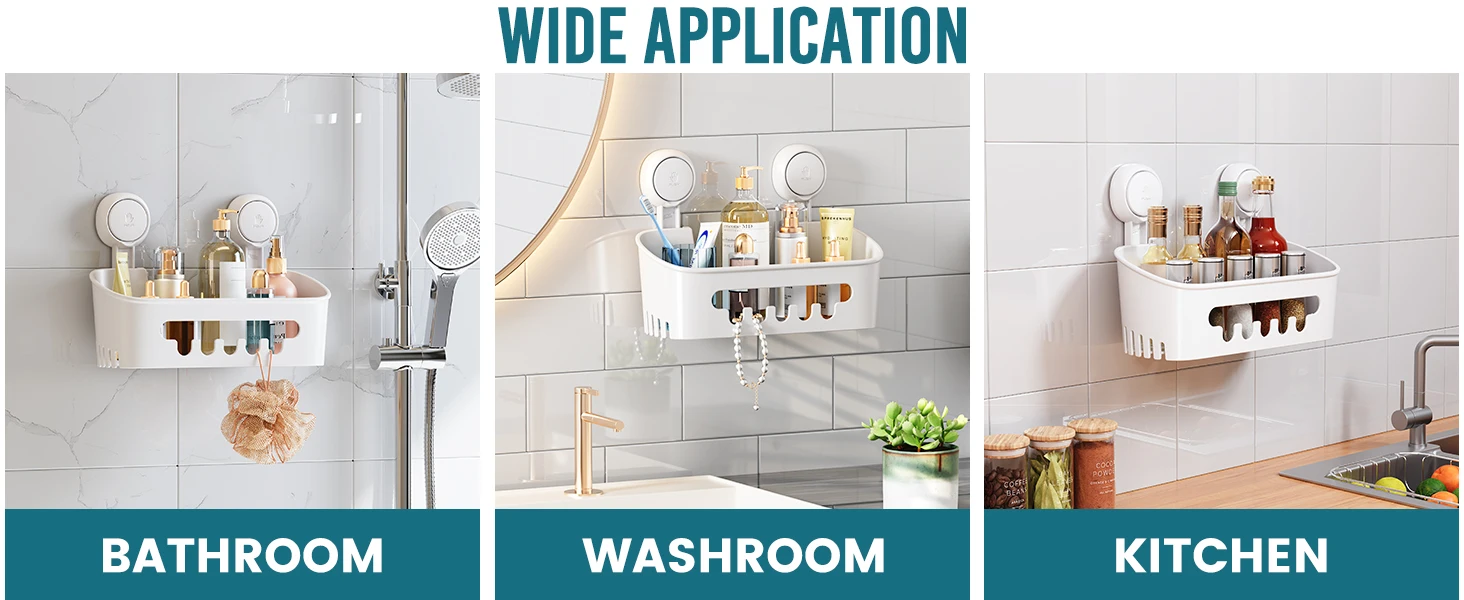 MUFTI-FUNCTIONAL: No screws, nails, glue, or tools are required for installation. This shower caddy with suction cups perfects for Bathroom & Kitchen Storage, such as shampoo, conditioner, shower gel, facial cleanser, loofahs, kitchen tools, etc., anywhere you needed to tidy up storage